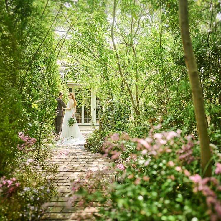 邸宅に寄り添うガーデンでは、挙式やパーティのワンシーンを、自然の光と風とともに楽しめます。屋内とはまた違う雰囲気のなか、おふたりとゲストの表情までもやわらかく彩ってくれます。